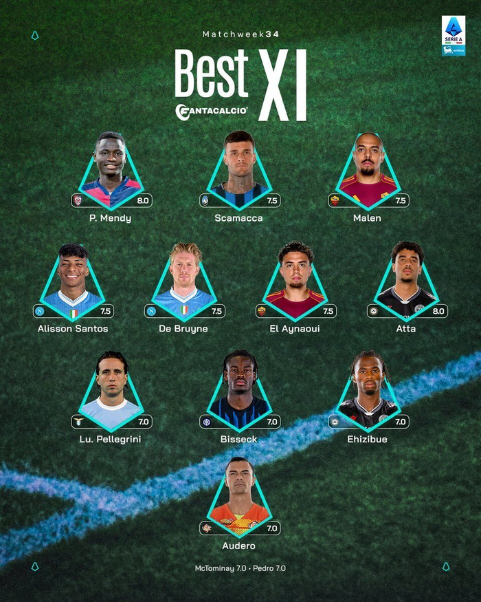 意甲第34轮最佳阵容:德布劳内领衔,比塞克、马伦入选